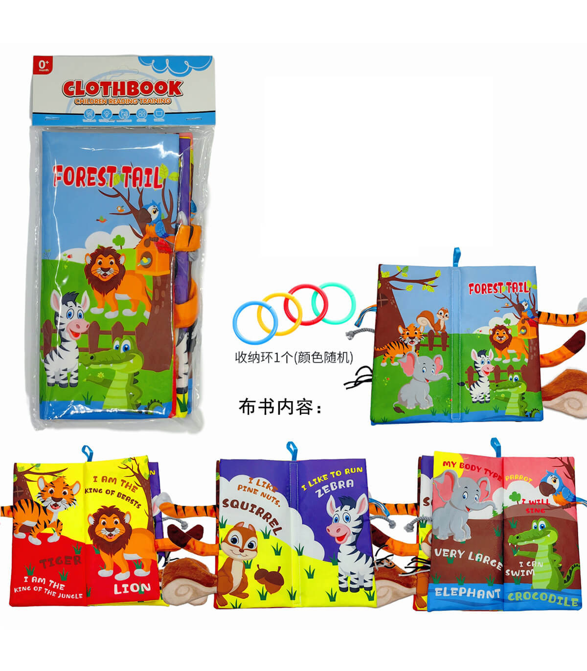 Baby textile book with a ring for hanging on a stroller or bassinet, designed for the smallest. It consists of a total of 4 pages that will introduce children to different animals and some of their characteristics.