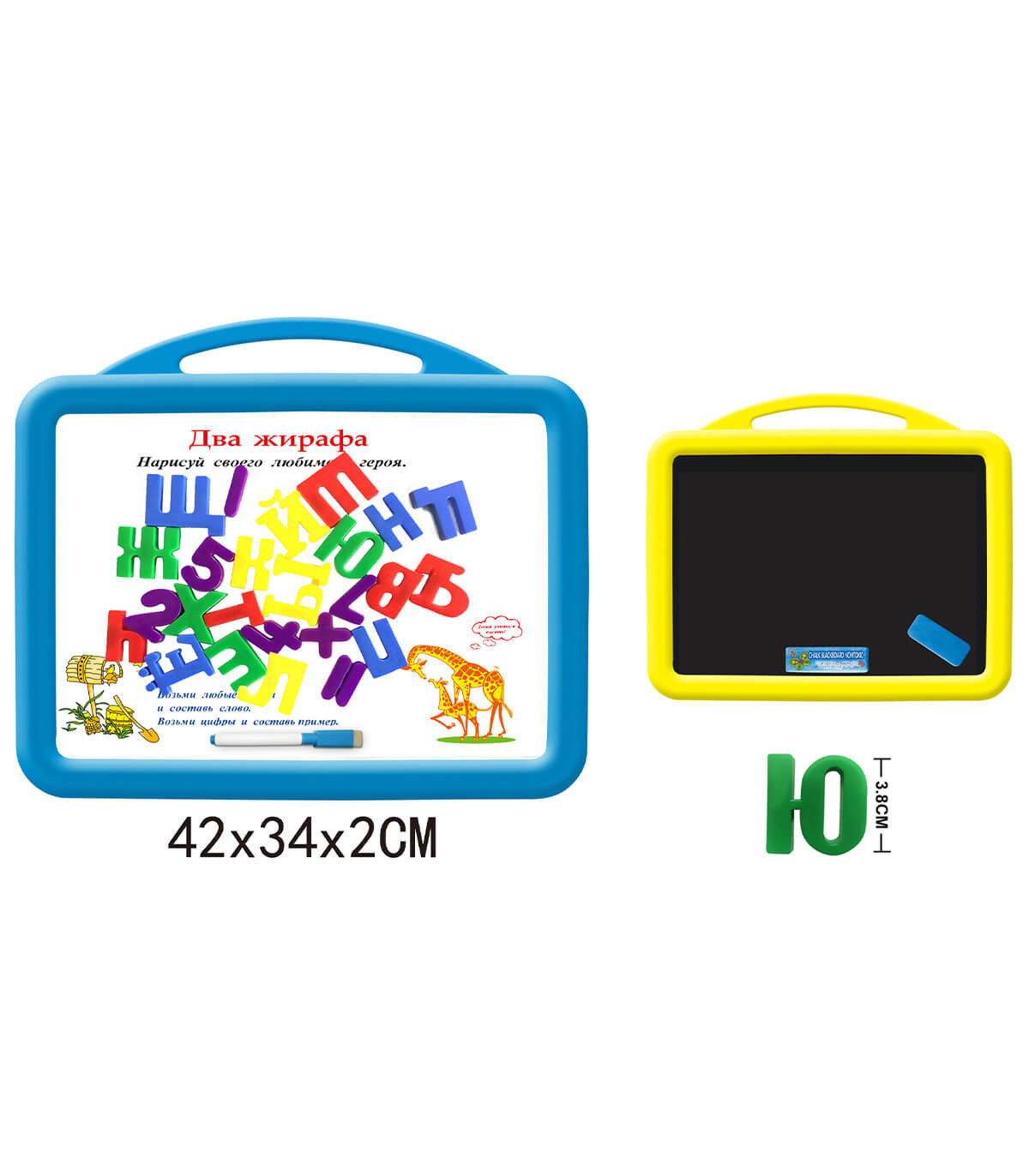 Educational drawing and writing board with 2 sides – white magnetic and black. Includes magnetic letters in Cyrillic, numbers from 0 to 9, signs -, +, ÷, ×, =, marker, 2 pieces of chalk, sponge. Packaging: bag. Suitable for girls and boys over 3 years old.