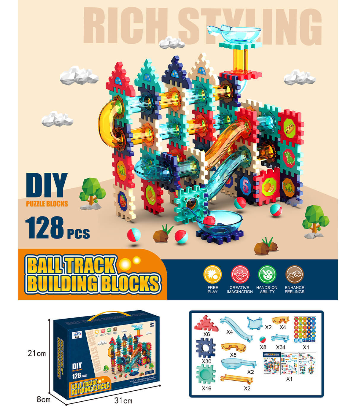 The 128-piece ball and slide construction set is the perfect toy that will offer your child endless hours of fun and entertainment. This builder is specially designed to develop children's creative thinking and imagination, challenging them to create different structures and have fun with the balls.