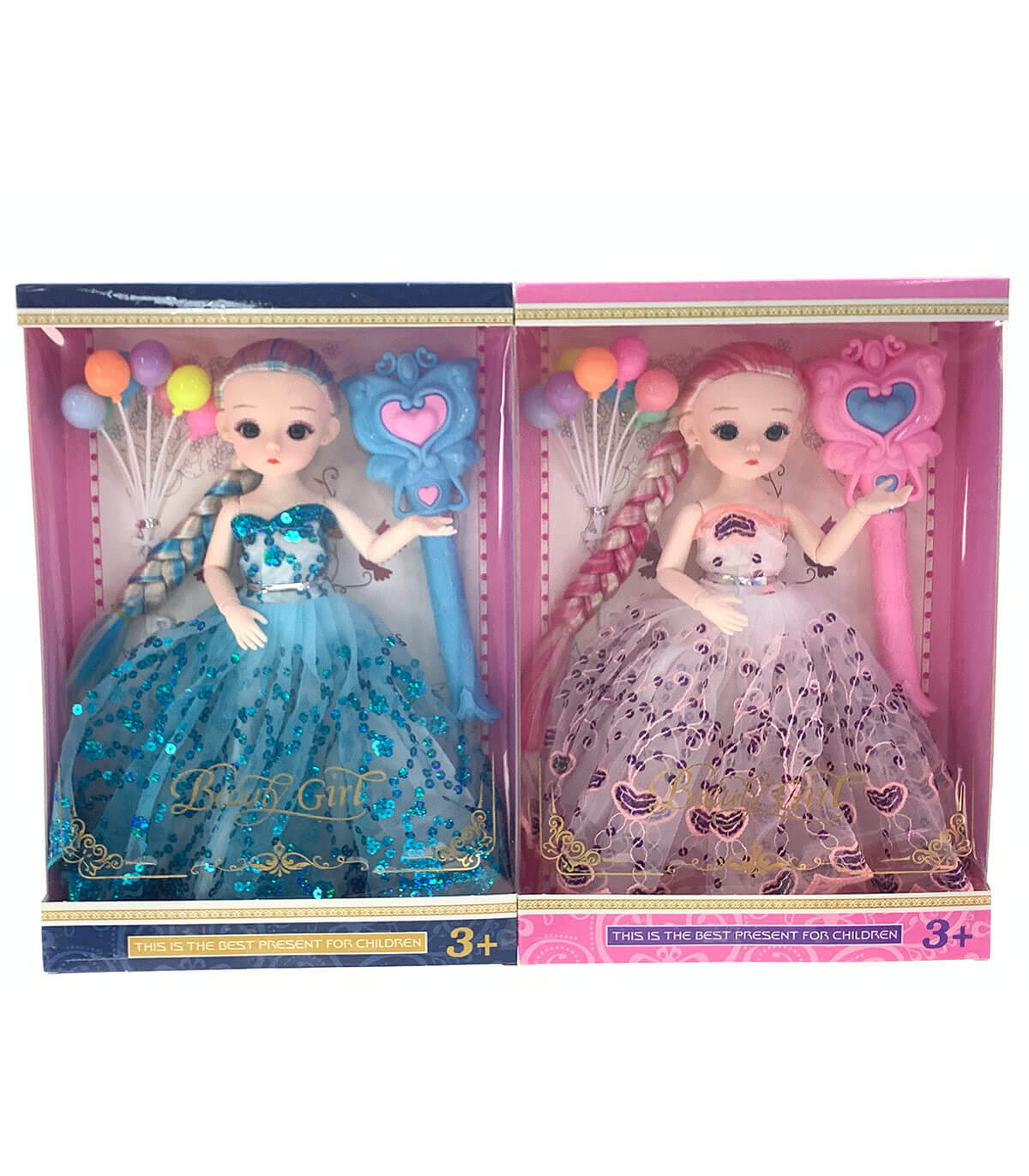 Breakable Limbs, Wand and Balloons Doll features an adorable doll with long hair wearing a gorgeous, rich sequin dress. It is made of thick, strong plastic, and its limbs - arms and legs, break at the elbows, wrists and knees. This allows the child to put her in different positions and play with her in a variety of ways.