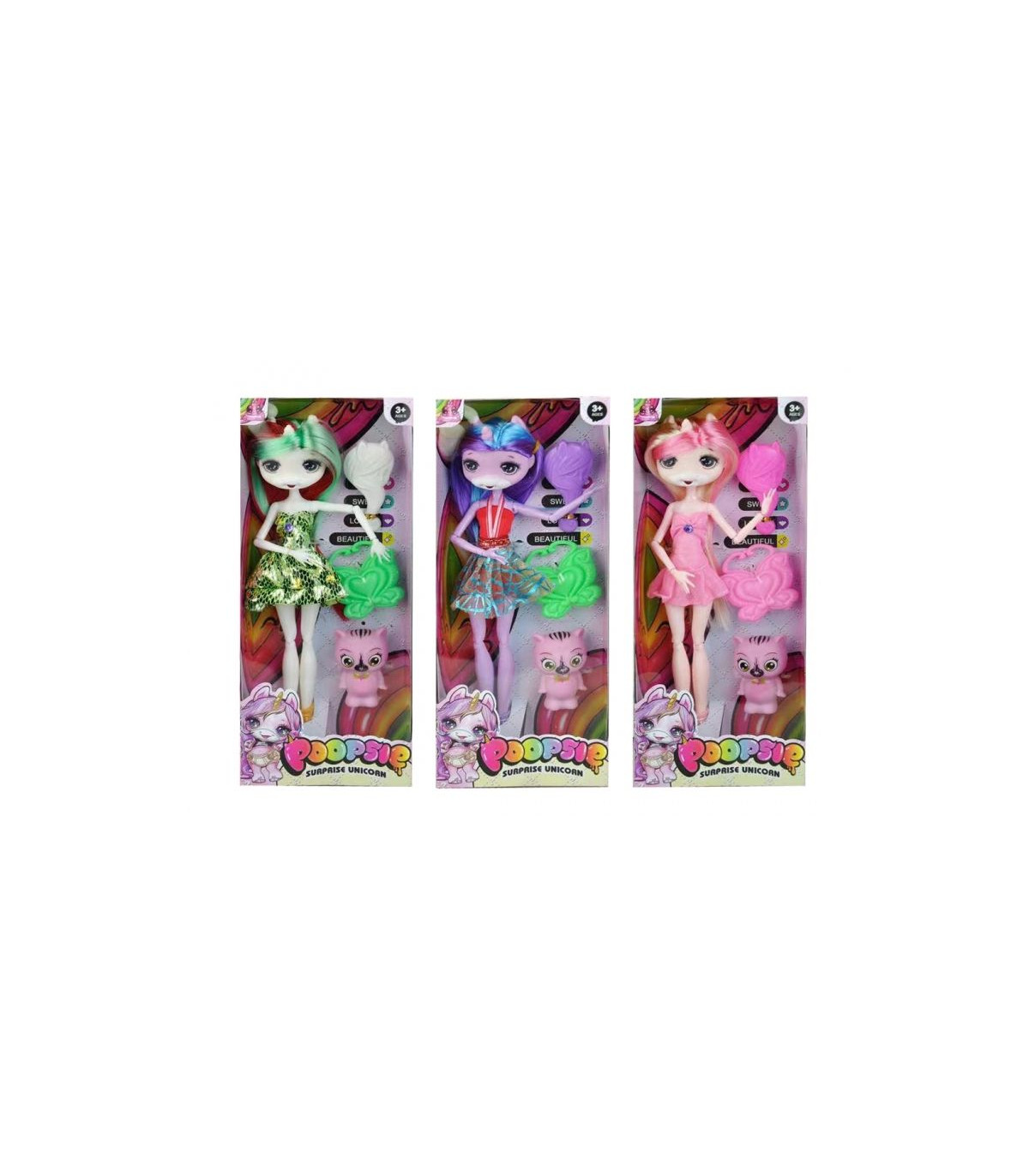 Unicorn doll with an attractive look, dressed in a fresh dress and complete with a hairbrush, butterfly bag and rubber animal. Her arms and legs are movable and break at several points - wrists, elbows and knees. Choose one set or make a collection of all three - so the games will become more than fun!