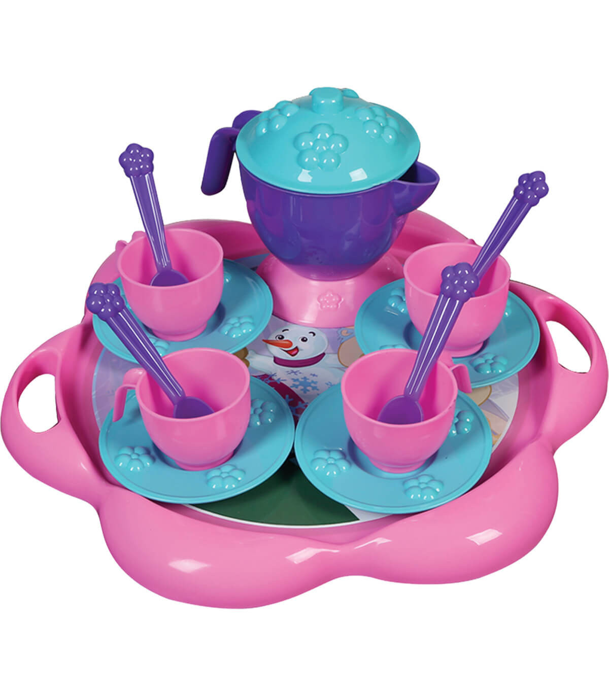 A children's tea set with cheerful pictures that will appeal to every little girl. It is made of strong plastic in bright colors and contains everything you need for a great tea party - 4 sets of cups with saucers and spoons, a teapot and a serving tray.