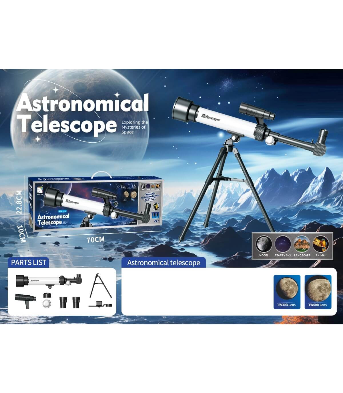 Large telescope for children with a smartphone holder and 2 lenses with magnification power of 30x and 60x. With focus adjustment capability, sturdy tripod, compass, eye protection function. Includes instructions for use. Suitable for girls and boys over 8 years old.