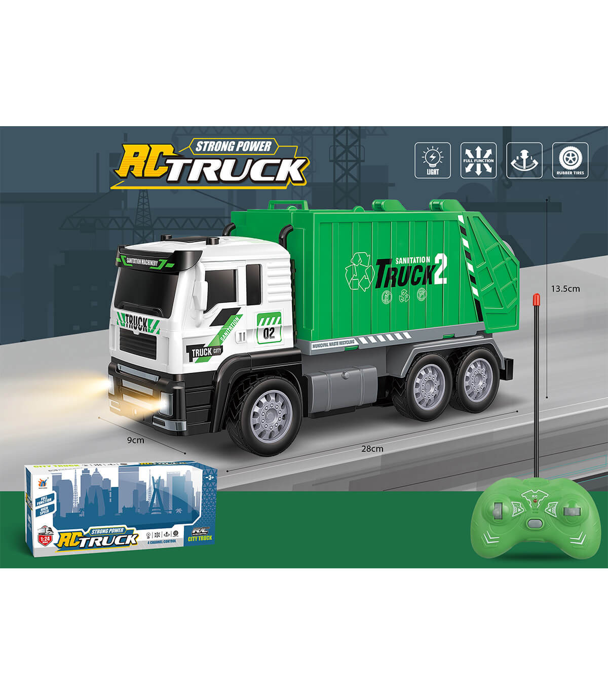Garbage truck 1:24 with remote control. The toy has 6 rubber wheels, full radio control of movement, lights. Suitable for boys over 3 years old and girls who like car games. Ideal gift for a birthday, Christmas, or other occasion.