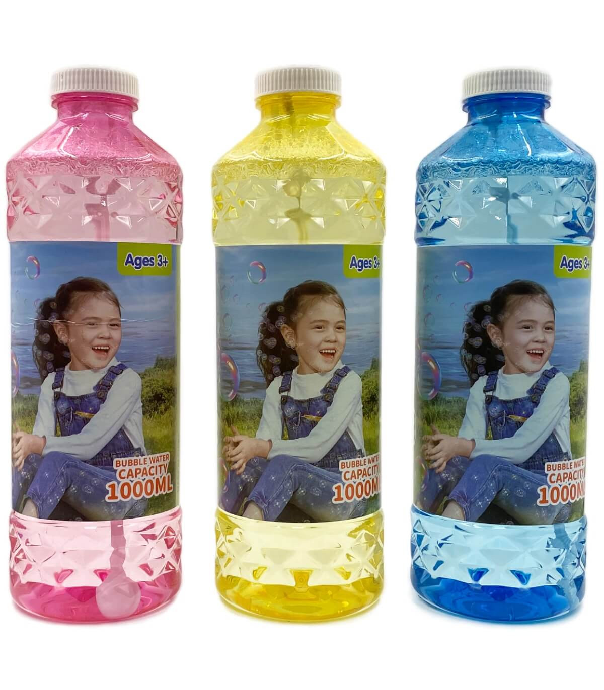Bubble solution in a colorful plastic bottle, with included stick. Suitable for wands, lawn mowers, guns, and all kinds of bubble-making toys.